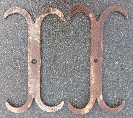 2 large antique wrought iron building wall tie / pattress plates with bars. A) 460mm x 210mm x 955mm bar length. B) 590mm x 240mm x 960mm bar length – SOLD £95 each AMX006 |