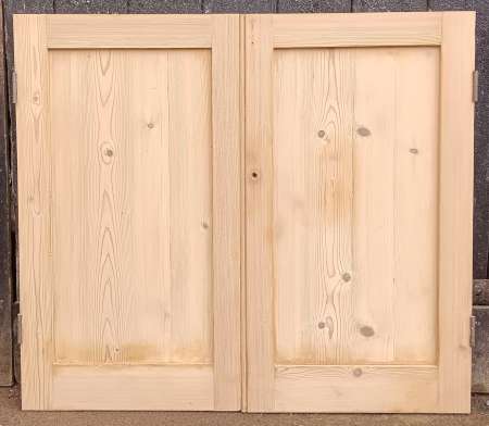 Pair of non-rebated reclaimed hardwood cupboard doors with 3 sets of brass hinges.