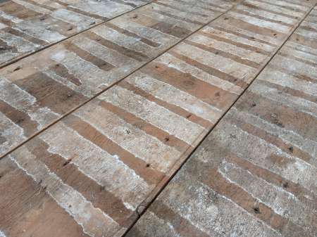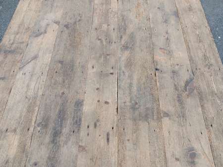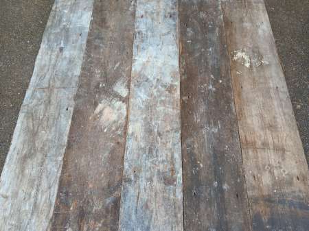 Solid & good quality boards of full inch thickness or approx. 24mm. 130mm in width and generally very long lengths of up to 198″ / 5 metres with only very few short lengths. Images showing boards as salvaged with a section having been fairly lightly sanded. 32.3 square yards / 27.6 square metres in total available. £45 per square yard FWX001 |