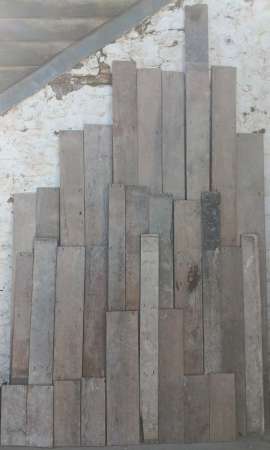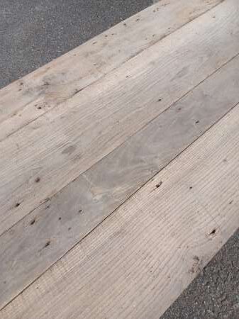 Random widths of 7 ” – 8″. Lengths: 100″, 59″, 3 @ 27″ & 25″ Varying in thickness slightly 17mm – 23mm. Good solid boards with no rot or woodworm. Boards have remains of a thin layer of varnish on them which just needs a light sanding to remove – please see short board on left. Approx. 1.3 sq yards now remaining. £150 per sq yard FWX008 |