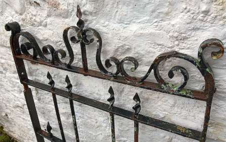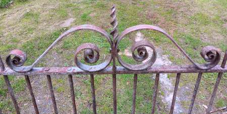 Heavy and well made in riveted wrought iron. 2857mm in length including hinge & latch x 1170mm max. height. Generally in good solid condition but for a few bends that may need straightening, a missing latch on one gate and small loses to 2 of the cast iron motifs. Would make a very nice set of 18 foot wide entrance gates with relatively little work. More images available. £2495 GRX015 |