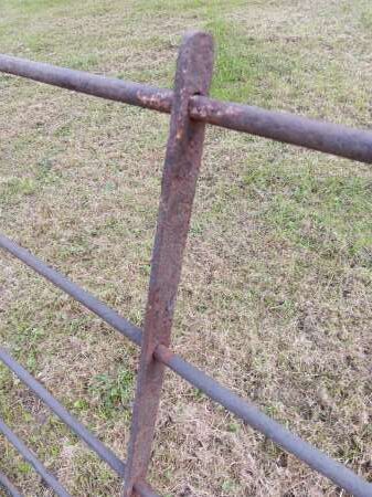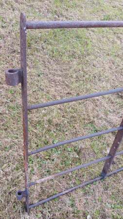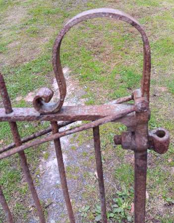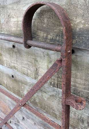 Latch fully functional. 1420mm max. height x 2855mm in width inc. hinge. Generally a very solid gate usable as is but could do with welding in a few places & some original rivets being replaced. Fairly straight but a little wonky as shown in images. £525 GRX032 |