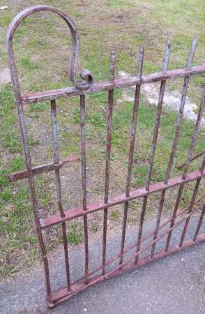 Gate : 1370mm in height x 912mm in width not inc. hinge. Post : 75mm diameter x 1895mm in height Gate & post hinged together : 1060mm in width. Curved section : 780mm in width x 920mm in depth. Base of post has been repaired at some point with replacement lower section welded in from just above lower hinge. The 4 legs to the curved section have also had replacement sections welded in at some point but all below ground level once installed. £995 GRX030 |