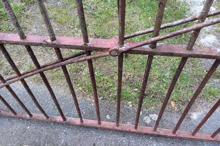 Height above ground approx. 1830mm. Panel lengths of 1920mm, 1360mm, 1230mm, 1020mm, 770mm & 520mm / The 1230mm & 1020mm sections have been welded together at some point rather than being bolted. Was originally installed in a “L” shape but could be reconfigured. Gate : 605mm in width not inc. hinge. Total running length of approx. 7.4 metres. A few minor bends which will easily straighten. Only surface rust to the ironwork other than approx. 700mm of bottom rail on 1020mm section which will require some attention. £ SOLD GRX047 |