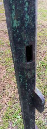 2350mm max. length with approx. 1440mm above ground. 75mm square section at bottom hinge level. Foot : 455mm x 300mm. Left : a receiving post with original keep & an additional keep bolted over it – SOLD Middle : a hinge post with only a bottom hinge pin fitted which is slightly bent. Right : a hinge post with 2 hinge pins fitted but bottom one is damaged but repairable – SOLD Hinge pins are bolted on through square holes cast into the posts so can be removed / replaced easily. £250 each GRX013 |