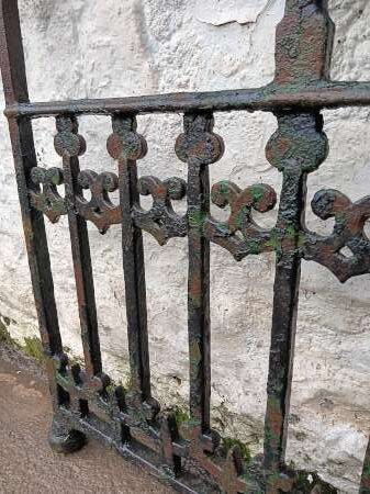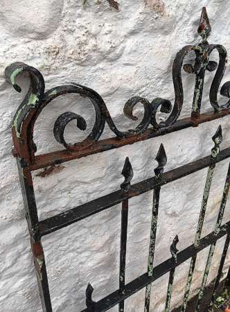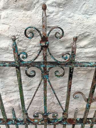 2040mm max. height x 2690mm total width. These will require some restoration work. Very solid metalwork with no rust issues and very nearly perfectly straight. A couple of vertical round bars & some finials missing. Cast iron scrollwork section to the right gate is all present but will need refitting. The lose section could be used to make a mould to replicate sufficient to restore that on the left gate. Ditto the missing finials. £895 GRX008 |
