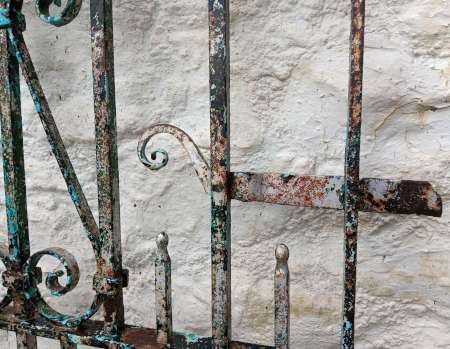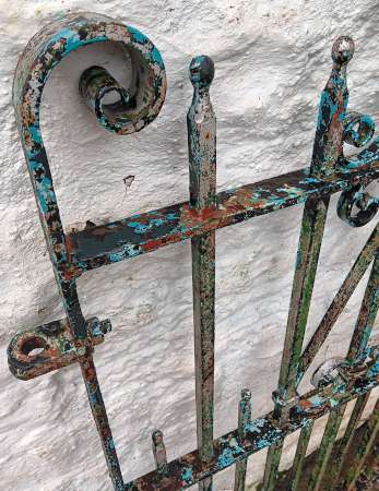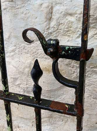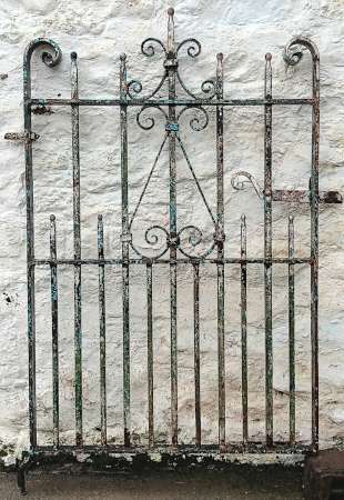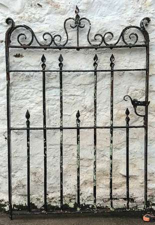 A large & heavy antique wrought iron residential entrance gate . 2770mm in width inc. hinges x 1520mm max. height. A few relatively minor bends but a very solid old gate indeed with only light surface rust. Fully functioning latch. £1200 GRX023 |