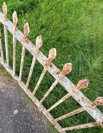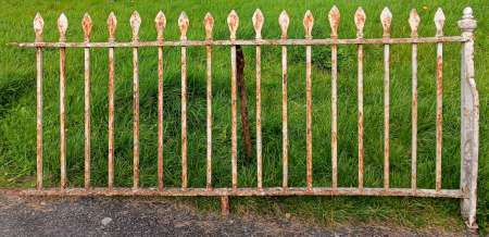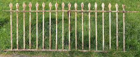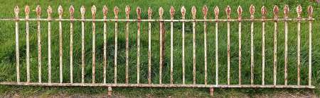 Max. height of 615mm. Lengths of 4200mm, 4175mm & 4180mm with additional small section of 495mm bolted on. Approx. 13 running metres in total length. Generally very straight with good solid metalwork other than the base rail of the 495mm section which is poor. 12 finials missing which could be fairly easily replaced ( I have 4 matching antique finials to be included in sale) or the existing could be rearranged to provide complete railings of just over 11 running metres. £795 GRX003 |