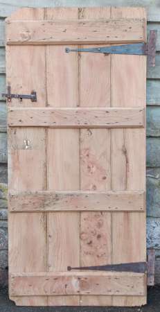 An early rustic ledged elm door with original blacksmithmade T – hinges and thumb latch.