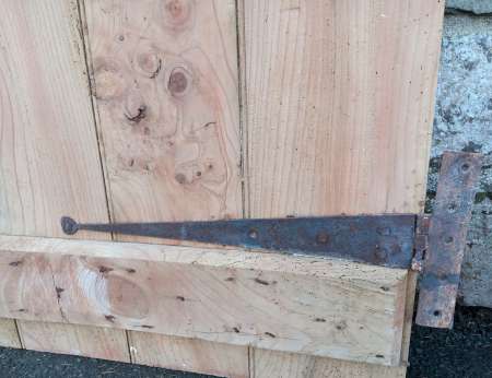 An antique 4 plank ledged elm door with original blacksmithmade T- hinges.